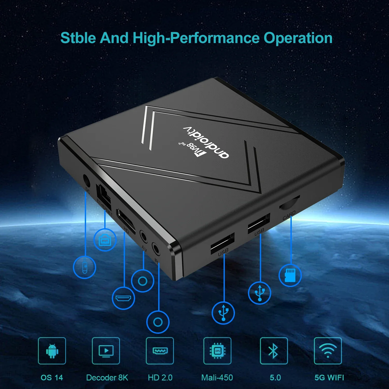 - نظام التشغيل: يعمل بنظام Android 14 (واجهة ATV المخصصة للتلفزيون)، مما يوفر واجهة مستخدم سلسة وتوافقاً مع أحدث التطبيقات.
